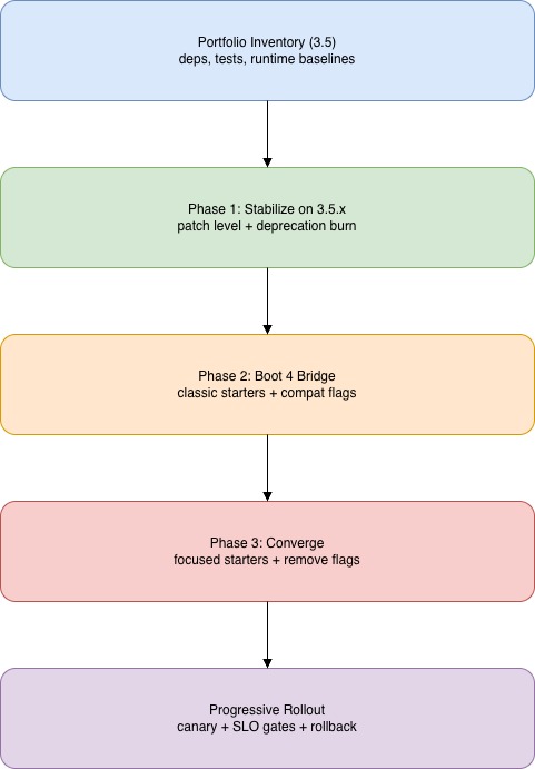 - A phased migration strategy from Spring Boot 3.5 to 4.0