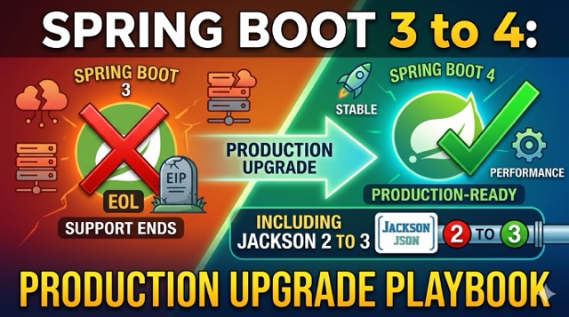 If your services are still on Spring Boot 3.x, I wrote this as a practical, production-oriented playbook to move to Spring Boot 4 safely, with explicit attention to end-of-life (EOL) risk, CVE exposure, and Jackson 2 to Jackson 3 changes.